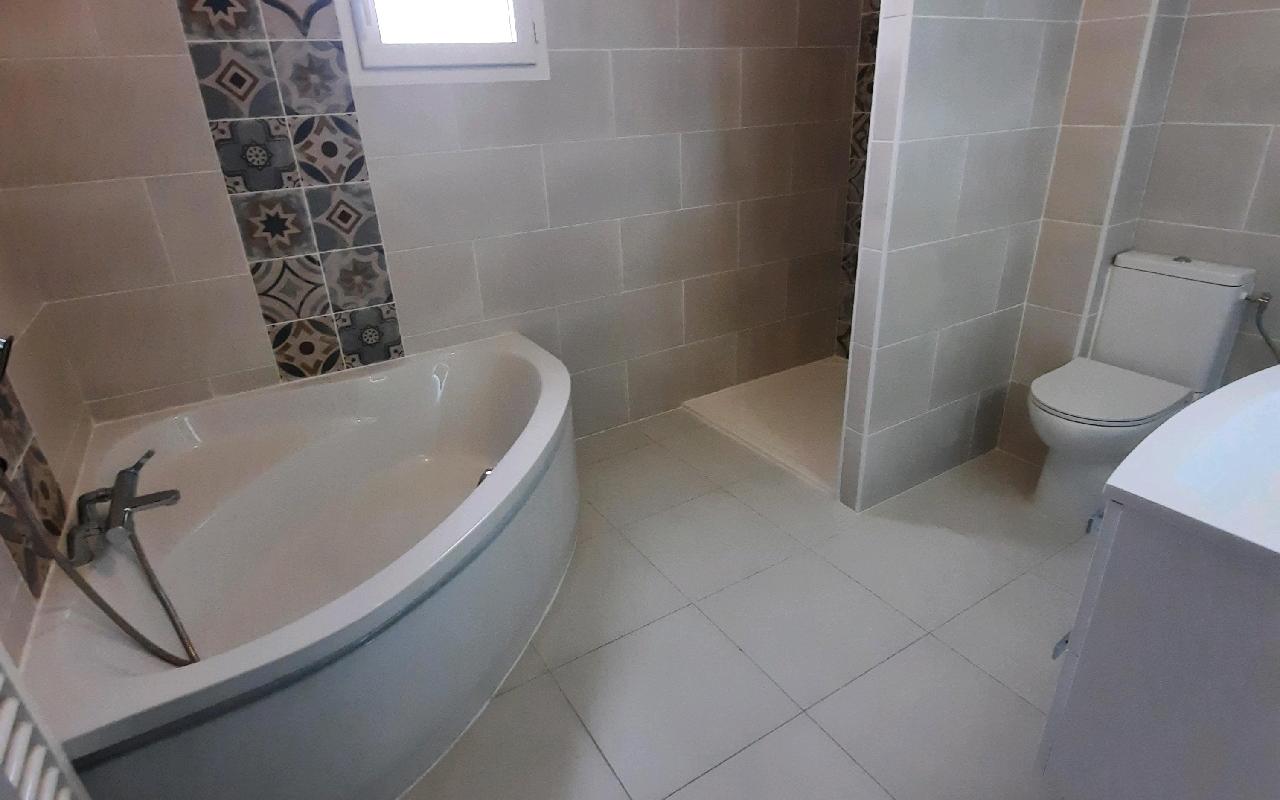 A l'étage : dégagement, trois chambres, salle de bains avec baignoire, douche et Wc.
